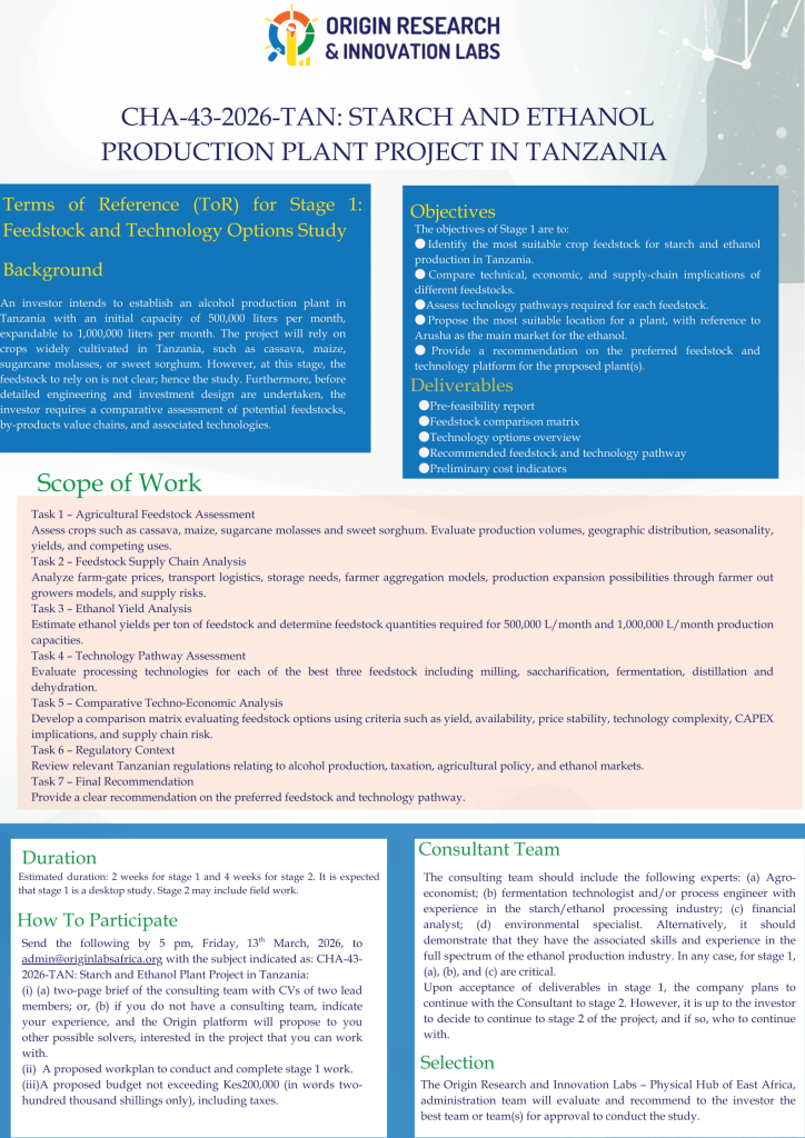 Send the following by 5 pm, Friday, 13th March, 2026, to admin@originlabsafrica.org with the subject indicated as: CHA-43-2026-TAN: Starch and Ethanol Plant Project in Tanzania: